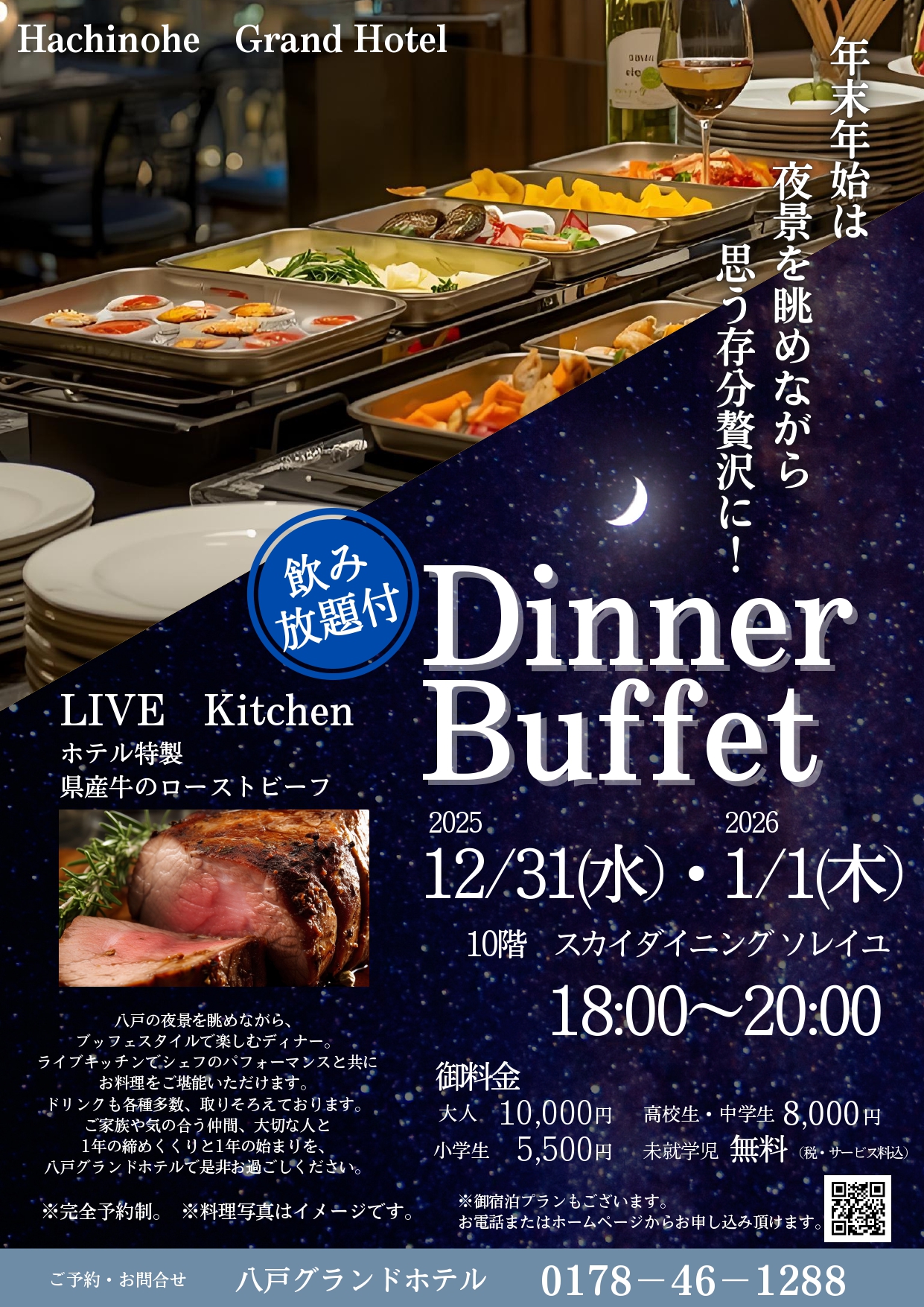 イベント情報, レストラン 年末年始 特別ディナーブッフェのご案内 年末年始は八戸グランドホテルで特別ディナーブッフェ 夜景と一緒に楽しむ豪華ブッフェ&県産牛ローストビーフ! ビール、ワイン、ウイスキー等のアルコールのほか、ソフトドリンクも飲み放題! お得な宿泊プランもございます。 席に限りがございますのでご予約はお早めに! お問合せ 0178-46―1288 2025年11月29日/作成者: admin https://hachinohegrandhotel.com/wp-content/uploads/2025-dinnerbuffet-bnr.jpg 646 801 admin https://hachinohegrandhotel.com/wp-content/uploads/2018/11/hgh-logo-01d.png admin2025-11-29 12:09:372025-11-29 12:09:37年末年始 特別ディナーブッフェのご案内