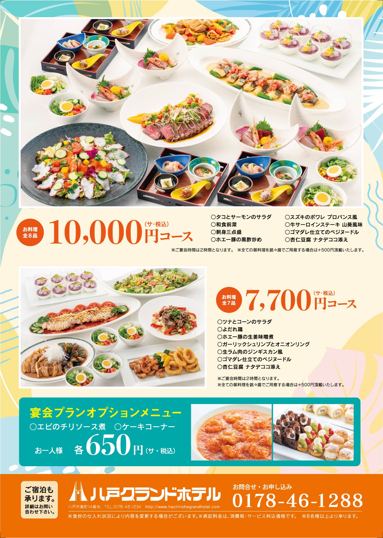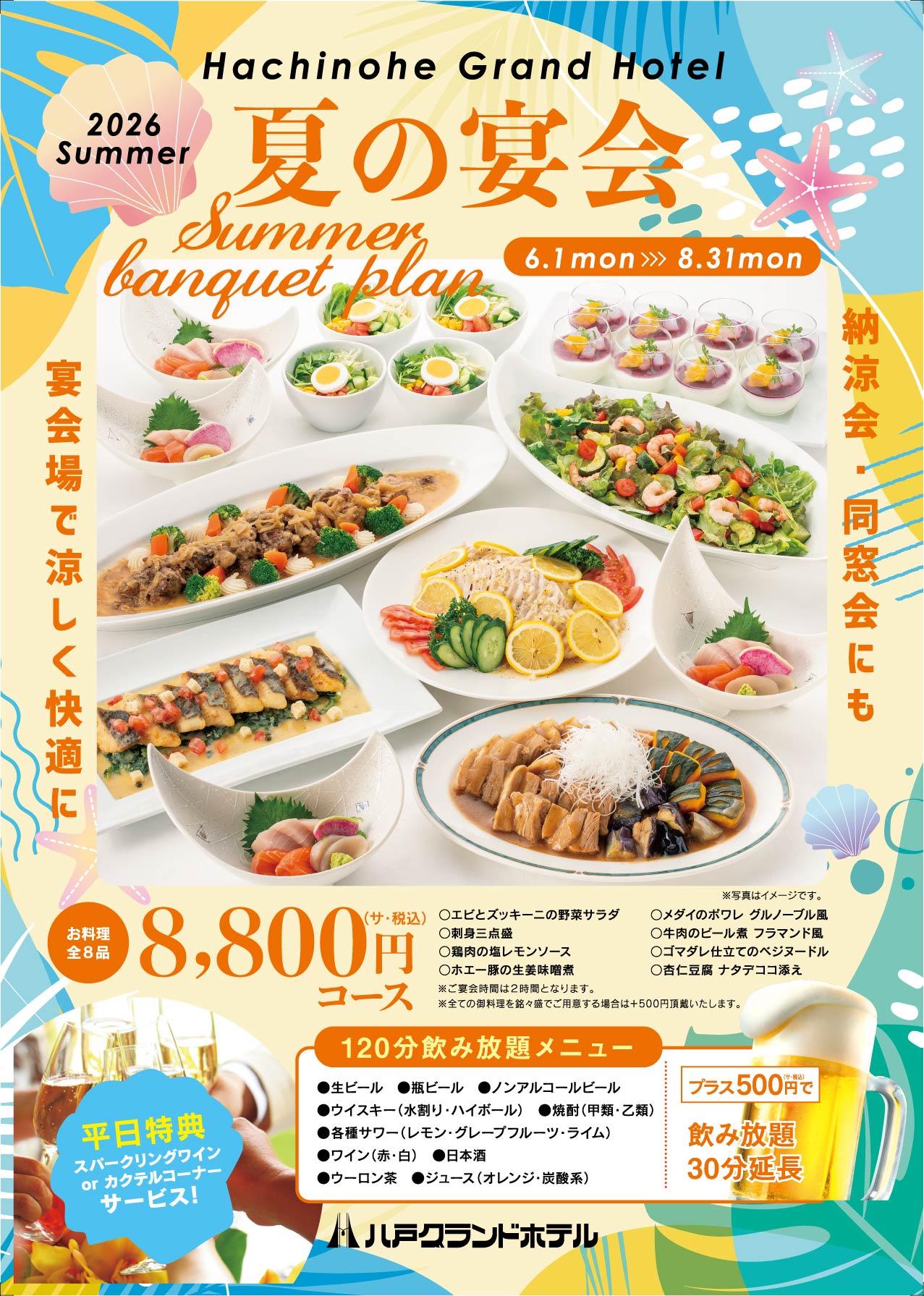 宴会 夏の宴会プランのご案内 納涼会・同窓会など、各種夏のご宴会に新メニュー登場! 八戸グランドホテルの夏の宴会プラン ■期間:2026年6月1日~8月31日 ■ご予約は8名様より承ります。 ご予約・お問合せは ——————————————- 八戸グランドホテル 0120-46-1288まで 2026年4月27日/作成者: admin https://hachinohegrandhotel.com/wp-content/uploads/hgh-2026-summer-bnr.jpg 646 800 admin https://hachinohegrandhotel.com/wp-content/uploads/2018/11/hgh-logo-01d.png admin2026-04-27 08:46:342026-04-27 08:46:34夏の宴会プランのご案内
