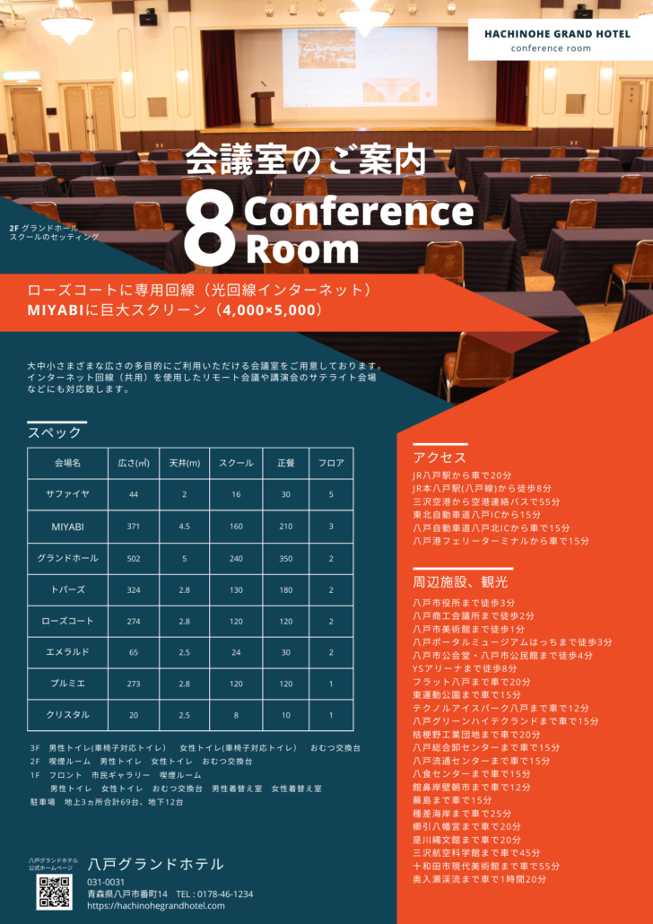 八戸グランドホテルが誇る、502m2のネオ・クラシカルな大宴会場。ウエディングから大規模な会議、宴会に適しています。1/2室でもご利用いただける、フレキシブルなユーティリティスペースです。